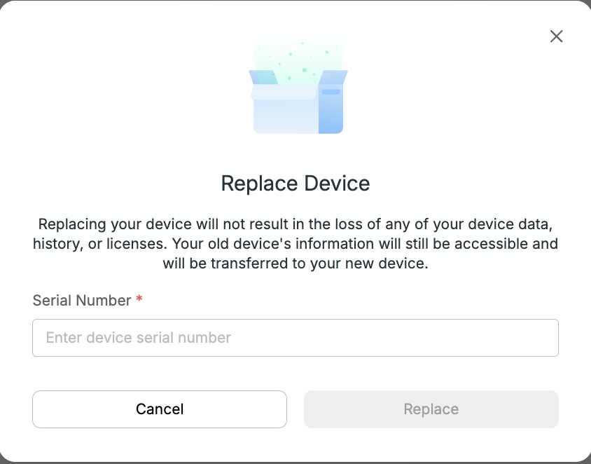 Click the Replace Device button to confirm the replacement of the device. The device should now be able to re-authenticate with the platform, preserving all historical data.